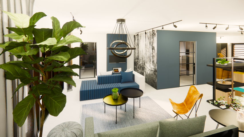 In this interior design project, the kitchen and dining area underwent a renovation. The kitchen was transformed with the addition of dark-shaded cabinets, hexagon tiles, and a vibrant blue accent wall. A dining nook was also crafted, featuring an L-shaped bench and modern lighting fixtures.